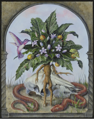 Mandragora officinarum, commonly known as the mandrake, has long been associated with the arts of healing, harming, and hexing, boasting a rich history of use throughout its indigenous territories bordering the Mediterranean Sea. Myths and folklore surrounding its use are endless and the plant has been referenced in numerous works and writings, ranging from the Bible to English literature to poetry from the Middle Ages. Its first scholarly documentation appears in an illustrated manuscript from the early 6th century, written by the Greek herbalist, Dioscorides, entitled the Juliana Anicia Codex. One specific illustration from this piece shows Dioscorides receiving the mandrake plant from Heuresis, the goddess of discovery, highlighting the belief that this plant was, indeed, that of the Gods.