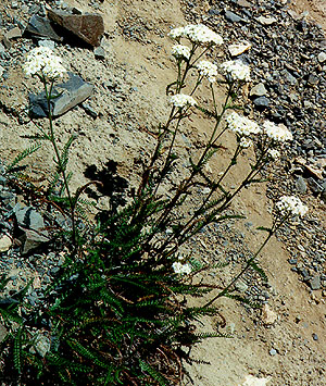 COMMON YARROW Common yarrow is a very common, perennial, herb 30-100 cm tall. Its alternate leaves are finely and pinnately dissected to appear almost feather-like. Common yarrow has flat- or round-topped clusters of heads (4-6 mm dia), each with about 5 white-petaled ray flowers and 10-30 cream-colored disk flowers. The fruits are flattened achenes without a pappus. Common yarrow grows in dry to moist open sites such as fields, meadows, roadsides, and clearings at low to high elevations. |