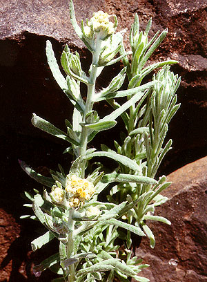 PEARLY EVERLASTING Pearly everlasting is a common, somewhat weedy, perennial herb with unbranched, leafy, white-wooly stems reaching 20-100 cm tall. The leaves are alternate, long and narrowly pointed, greenish above and white-wooly below. The heads are small with yellow disk flowers only; the involucral bracts are dry and whitish and can be mistaken for ray flowers. The heads are aggregated in dense flat-topped clusters. Pearly everlasting grows in open forest, clearings, fields, and roadsides throughout western Washington at low to subalpine elevations. |