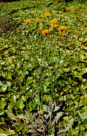 HAIRY CAT'S-EAR Hairy cat's-ear is an introduced perennial herb with milky sap. The leaves are all basal, lance-shaped and coarsely-toothed, with spreading hairs on both surfaces. The heads are composed entirely of yellow ray flowers. The leafless flowering stems are branched with several heads at the ends of each branch. Hairy cat's-ear is one of our worst lawn weeds in western Washington. It is also found on roadsides, patures and other disturbed ground at low elevations. |