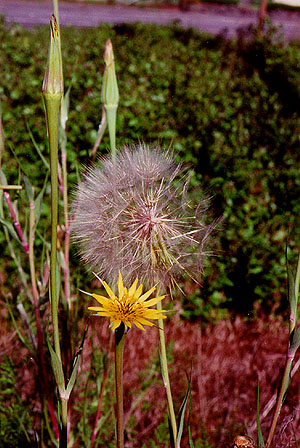 YELLOW SALSIFY Yellow salsify is an introduced biennial or an annual herb with milky sap. The stems are leafy, often branched and reach 30-100 cm tall. The stem is markedly swollen just below the heads. The alternate leaves clasp the stem at the base and are long, narrow, smooth-margined, and taper from the base to the tip. The solitary heads are composed of pale yellow ray flowers only with the involucre large (2.5-4 cm long) and cone-shaped in bud. Yellow salsify is common in relatively dry waste places such as railroad embankments, roadsides, and fields at low elevations. |