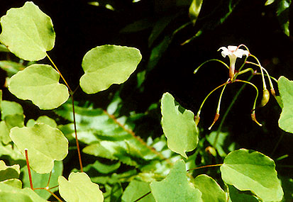 INSIDE-OUT FLOWER Berberidaceae Inside-out flower is so named because the white sepals and petals are swept backward to reveal the pistil and 6 stamens (=hexandra). This perennial herb grows only 10-40 cm tall with compound leaves twice divided in 3's, with ultimate segments heart- or egg-shaped. The seeds of inside-out flower have fleshy appendages and are ant- (and possibly wasp-) dispersed. Inside-out flower is common in moist shady forest understories from low to middle elevations. |