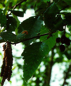 RED ALDER Betulaceae Red alder is a small deciduous tree up to 25 m tall, with thin, smooth, gray bark almost always supporting white patches of lichens. The wood and inner bark turn rusty-red when cut. The leaves are alternate, broadly elliptic but acute at the tip, and 5-15 cm long. The upper surface is dull green and smooth; the lower surface is rust-colored and hairy. The leaf margins are wavy with coarse, blunt teeth. The male flowers are in elongated, pendent catkins (5-12 cm) whereas the female flowers are in short, stout and eventually woody "cones." The seeds mature in late fall and clusters of the empty brown cones remain on the tree throughout the winter. Red alder generally occupies nitrogen-poor soils, often water-logged, because its roots are associated with a nitrogen-fixing actinomycete, Frankia. Because of its ability to add nitrogen to the soil, alder forests generally have a rich understory of grasses, sedges and ferns. |
