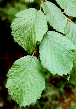 BEAKED HAZELNUT Beaked hazelnut is a very common shrub, 1-4 m tall, in moist but well-drained sites at low to middle elevations under open forests, in clearings, and along streams. The male and female flowers bloom in very early spring, before the leaves appear. The male catkins are the typical elongated and paper structures; the female catkins are very small and the red stigmas protrude out of the ends. The fruits are spherical, edible nuts surrounded by a light-green husk that extends beyond the nut into a beak. The fruits are usually in pairs or threes at the ends of branches. The leaves are elliptic with a heart-shaped base, a sharp-pointed tip, and a doubly toothed-margin. The winter twigs show a characteristic zig-zag pattern and globose buds. |