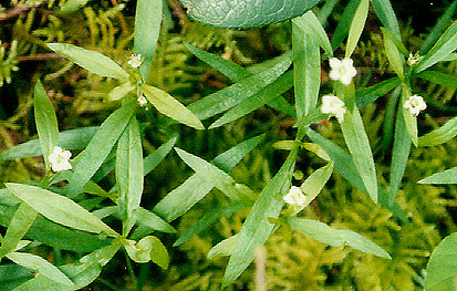 BIG-LEAVED SANDWORT Caryophyllaceae Big-leaved sandwort is a low (5-20 cm tall) understory species in moist forests. It is a rhizomatous perennial that forms loose mats. The leaves are opposite and narrowly lance-shaped. The flowers are small with 5 pointy-tipped sepals and 5 white petals about the same length as the sepals. This species has also been called Arenaria macrophylla, and there are 7 additional species of Arenaria that can be found in western Washington. |