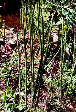 SCOURING RUSH Both the sterile and fertile stems of scouring rush are stout, unbranched, evergreen, and grow up to 1.5 m tall. Scouring rush is common on moist to wet, shaded to open, undisturbed sites as well as disturbed sites such as roadsides and railroad embankments. The cell walls of Equisetum species contain silicon dioxide, making them quite abrasive. Native Americans used Equisetum hymale stems to polish wooden objects and early Europeans used the stems to scour wooden and pewter utensils. The stems have also been used to hone reeds for woodwind instruments. |