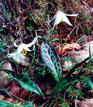 WHITE FAWN LILY White fawn lily is a low (to 30 cm) herbaceous perennial. The leaves are paired and basal, broadly lance-shaped and mottled with pale green and dark brown. The usually single flowers are nodding, white, with reflexed tepals. White fawn lily grows sporadically at low elevations in well-drained, open, grassy areas to fairly dense rocky woodlands. |
