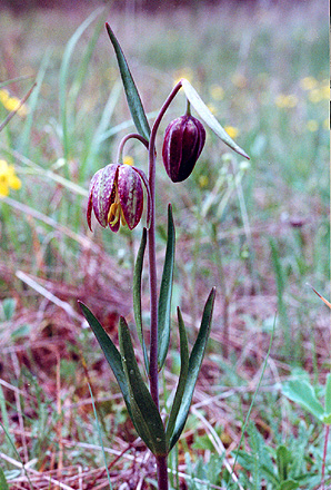 CHOCOLATE LILY Chocolate lily is an herbaceous perennial growing to 80 cm tall. The leaves are in whorls of 3-5, lance-shaped, 5-15 cm long. The flowers are dark purple mottled with greenish yellow, pendent, bell-shaped, single or in clusters of 2-5. Chocolate lily grows in open meadows and woods from low to subalpine elevations. |