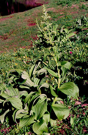 Veratrum viride Green false hellebore is a large (0.7-2 m tall), robust herbaceous perennial . The stems are unbranched and often clustered in groups. The leaves are large (10-35 cm long) and broad with prominent veins. The small pale-green flowers are borne in terminal branched spikes, the branches drooping. Green false hellebore grows in wet meadows and open forests from low to subalpine elevations, where it is most abundant. Green false hellebore is often apparently grazed by mammalian herbivores, but there is a report in the literature of this plant causing cyclopy (a single central eye) in cattle. |