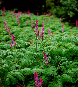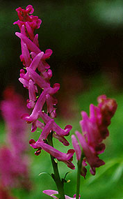 SCOULER'S CORYDALIS Papaveraceae (Fumariaceae) Scouler's corydalis is a large (1 m tall) glaucous perennial with 2 or 3 leaves arising midway up the stem and divided three times into small rounded ultimate segments. The showy pink-magenta flowers (each 2-3 cm long) are borne in a long raceme at the top of the plant. Scouler's corydalis is common along shaded streambanks at low elevations to middle elevations and blooms from April to June. |