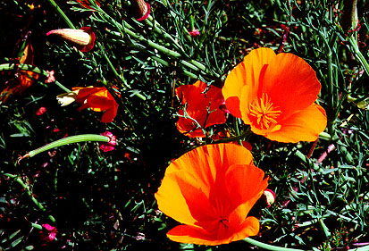 CALIFORNIA POPPY Papaveraceae California poppy is a small (10-50 cm tall) herbaceous annual or short-lived perennial. It has bluish-green, glaucous, much-divided basal leaves with very narrow ultimate segments. The yellow to orange (occasionally white) flowers are large and showy (1-5 cm across), usually solitary on long stems. The fruits are long thin capsules that fling seeds up to a meter away when they abruptly open. California poppy is native from the Columbia gorge south, but has been introduced to western Washington in wildflower mixture plantings. It is very common on roadsides, clearings, and dry rocky slopes at low elevations. |