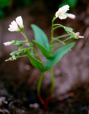 WESTERN SPRING BEAUTY Western spring-beauty is a small (5-20 cm tall) perennial wildflower common in moist subalpine meadows of the Olympics and Cascades. The two basal leaves are lance-shaped and slightly fleshy. The flowers have 5 white or pale pink petals, usually with pink veins, and have the 2 sepals characteristic of the family. There are typically only a few flowers in a loose cluster at the top of the stem. |
