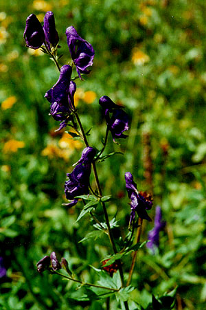 Columbian monkshood Columbian monkshood is a striking wildflower of rich, moist, meadows, streambanks, and forest openings at middle to high elevations. The leaves are palmately divided almost to the base. The upper part of the tall (0.5-2 m) stem supports numerous flowers, one in the axil of each leaf. The flowers are deep purple-blue and bilaterally symmetrical. The uppermost of the 5 petaloid sepals forms a hood and conceals two petals. Columbian monkshood, like all monkshoods, is highly poisonous; small children shouldn't be allowed even to touch the leaves. |
