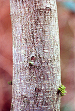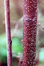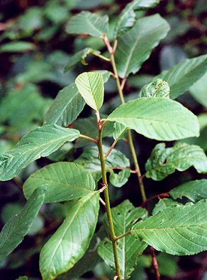 CASCARA Rhamnaceae Cascara is a shrub or small tree to 10 m tall. It has smooth grey bark that is often collected for its medicinal value. The leaves are alternate (but approach opposite on young growth), deciduous (although young plants may deep their leaves over winter), oval, glossy green, finely toothed, and with prominent pinnate veins. The flowers are small, greenish, and borne in short-stalked clusters in the axils of the leaves. Cascara is common in dry to wet, mixed conifer/deciduous forests, usually on south-facing hillsides at low to middle elevations. It commonly occurs with red alder and vine maple. |