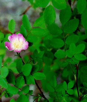 ![]() Rosa nutkana NOOTKA ROSE Rosaceae Nootka rose is a spindly shrub up to 3 m tall with a pair of large straight prickles at each node. The leaves are alternate, deciduous, and pinnately compound with 5-7 coarsely toothed leaflets. The flowers are pink, large (4-8 cm in diameter), and borne single at the branch tips. The fruits ("hips") are 1-2 cm across, purplish-red, and round. Nootka rose grows in open habitats such as meadows, thickets, and roadsides at low to middle elevations. |