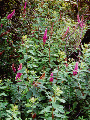 ![]() Spiraea douglasii HARDHACK Rosaceae Hardhack is an erect, branched shrub to 2 m tall that generally forms thickets on wet sites at low to middle elevations. The young branches are reddish-brown and wooly. The leaves are alternate, deciduous, oval, toothed around the upper half, green above and grey-wooly beneath. The flowers are pink to deep rose, tiny (5 mm), numerous in erect plumes at the tips of the branches. The fruits are clusters of several small follicles that remain erect on the plant throughout the winter. |