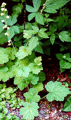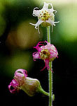 Tellima grandiflora Fragrant fringecup is an evergreen, herbaceous perennial with lobed, heart-shaped, coarsely-toothed basal leaves and 2-3 small leaves midway along the tall (50-80 cm) flowering stem. The flowers have a cup-like hypanthium with white to reddish, fringed petals spreading from the rim and 10 stamens. Fragrant fringecup is very common in moist forests at low to middle elevations. |