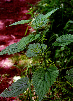 STINGING NETTLE Stinging nettle is a plant with which it is useful to become familiar as soon as it emerges in spring because, as its common name implies, it bites back. The stiff hollow hairs along the stem and along the veins on the backs of the leaves connect to glands that contain formic acid, which is released into the skin as the tip of the hair is broken by contact. The formic acid causes a temporary, but rather uncomfortable, skin irritation. Stinging nettle is very common on moist rich soil at low elevations all across western Washington. |